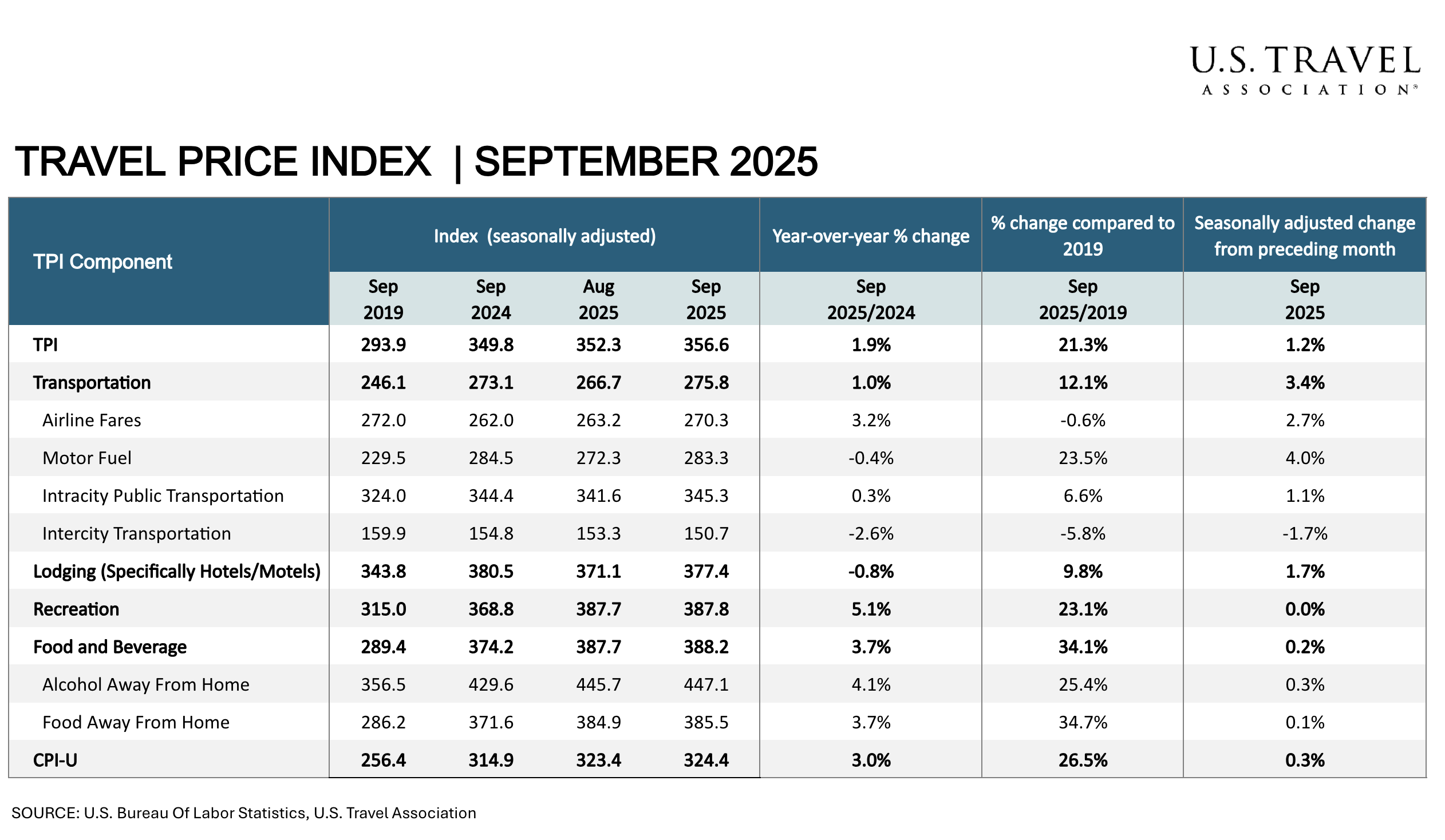 • TPI: Increased 1.2% in September, higher than overall price growth. On an annual basis, travel prices were up 1.9%, continuing a pattern of more moderate increases relative to the broader economy.