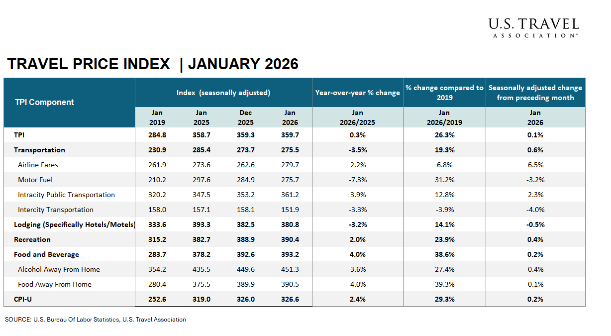 Research Monthly Insights Travel Price Index MONTHLY INSIGHTS February 13, 2026 The Travel Price Index (TPI) tracks the cost of travel in the United States using U.S. Department of Labor data from the monthly Consumer Price Index (CPI). Released monthly, the TPI is comparable to the CPI while focusing on travel-related expenses. Key InsightsJanuary data showed travel costs continuing to ease, with the Travel Price Index posting only a slight monthly increase while overall inflation held steady. Consumer prices rose 0.2% for the month and 2.4% on an annual basis, whereas travel prices edged up just 0.1% and were only 0.3% higher than a year ago. This gap suggests travel remains relatively affordable for consumers compared with the broader economy. Category HighlightsThe TPI's modest monthly increase was driven primarily by a notable rebound in airfares, partially offset by falling fuel costs and a continued pullback in lodging prices. Over longer-term comparisons, travel prices remain well below overall inflation on an annual basis. Airfares rose 6.5% in January, following December’s 5.2% increase, and now stand 2.2% above year-ago levels. Hotel prices continued to ease, falling 0.5% after December's 3.5% gain, and remain 3.2% below January 2025 levels. Gas prices declined 3.2% for the month and are now 7.3% lower than last year, representing the most significant year-over-year decrease among TPI components. Food and beverage prices, up 4.0% annually, and recreation, up 2.0%, remain the only TPI categories outpacing overall inflation on an annual basis. Note: The Bureau of Labor Statistics released annual seasonal adjustment revisions with this report, resulting in minor updates to historical figures over the past five years. Explore additional data and insights via the U.S. Travel Insights Dashboard. Travel Price Index (TPI) December 2025 Travel Price Index (TPI) November 2025 Travel Price Index (TPI) September 2025 Travel Price Index (TPI) August 2025 Travel Price Index (TPI) July 2025 Member Price: $0 Non-Member Price: $0 Become a member to access.